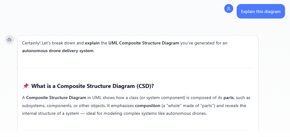 Don’t like something? Say “Add a port for diagnostics on the Engine” or “Show multiplicity 4 on Wheels” or “Explain why this connector delegates to the part.” The chatbot refines it instantly. Ask for variations, generate related diagrams (like class or sequence), or even export to image/report. It’s conversational, fast, and bridges the gap between idea and visual.