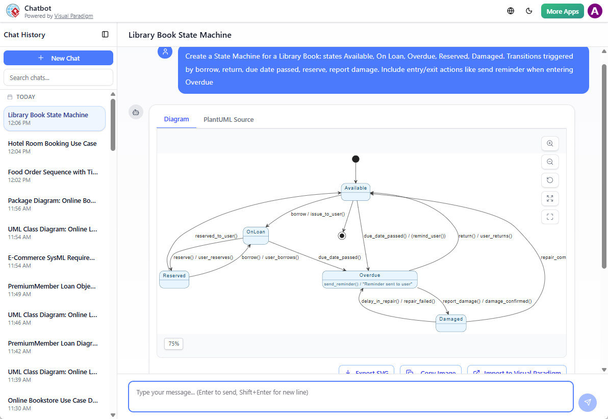 • “Create a State Machine for a Library Book: states Available, On Loan, Overdue, Reserved, Damaged. Transitions triggered by borrow, return, due date passed, reserve, report damage. Include entry/exit actions like send reminder when entering Overdue.”