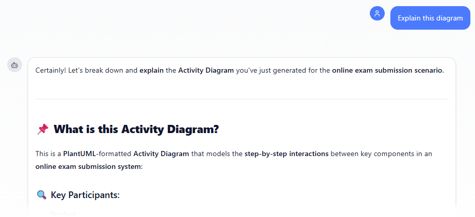 Type: “Create an activity diagram for user registration in a web app, including email verification and error handling.” Seconds later, you get a structured diagram with actions, decisions, and flows. Not happy? Say “Add a parallel path for social login” or “Explain the decision node for password strength.” It refines on the spot, answers questions, or even generates related reports.