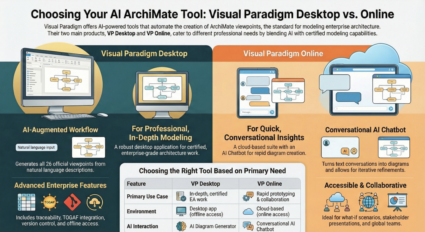 Together, they provide a comprehensive ecosystem: Generate viewpoints in the chatbot, then refine in Desktop. This synergy makes Visual Paradigm the ultimate AI ArchiMate modeling solution, blending power and simplicity.