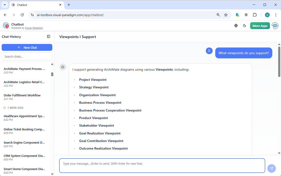 For those preferring a cloud-based, accessible approach, Visual Paradigm Online (VP Online) includes our groundbreaking AI Chatbot (available at chat.visual-paradigm.com or integrated into the platform). This AI ArchiMate tool turns natural language conversations into precise ArchiMate viewpoints, making it ideal for rapid prototyping, consultations, and global teams.