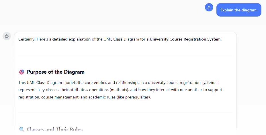 - Review, refine, and embed the diagram: The AI generates a professional class diagram instantly.