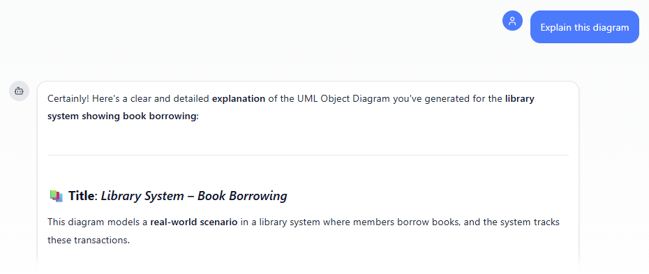 3. Describe what you want: In the text input area at the bottom, type a clear description of your project, system, or scenario (e.g. “Produce a UML Object Diagram for a library system showing borrowing of books”). Press Enter (or click the send icon) to submit your message.