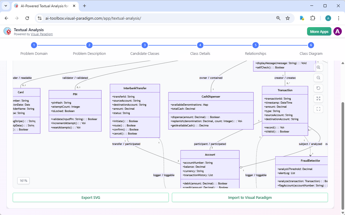 The AI-Powered Textual Analysis app guides users through a structured 6-step process to analyze unstructured text or problem domains, automatically identifying candidate classes, attributes, operations, and relationships from natural language input, then generating an editable UML Class Diagram directly from the analysis.