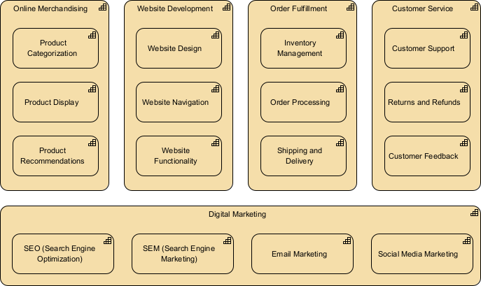 First, they would identify their main business capabilities, such as online merchandising, website development, digital marketing, order fulfillment, and customer service. They would then map out these capabilities in a hierarchical diagram, showing how they are related to each other.