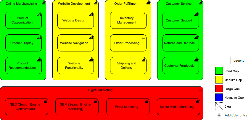 By analyzing the Capability Map, the company might identify areas where they need to improve. For example, they might see that their website development capability is not as strong as it needs to be, or that their digital marketing capability is not generating enough traffic to their website. They might also identify areas of redundancy or inefficiency, such as duplicate efforts in order fulfillment.