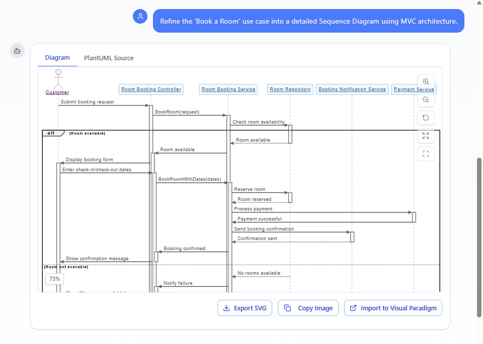 Visual Paradigm’s AI Chatbot excels at this refinement step. It takes your conceptual use-case description or existing Activity/Use Case Diagram and—through guided or fully automated prompts—produces a refined Sequence Diagram that maps the high-level flow onto a chosen architectural pattern (most commonly MVC), complete with realistic method signatures drawn from the underlying Class Diagram.