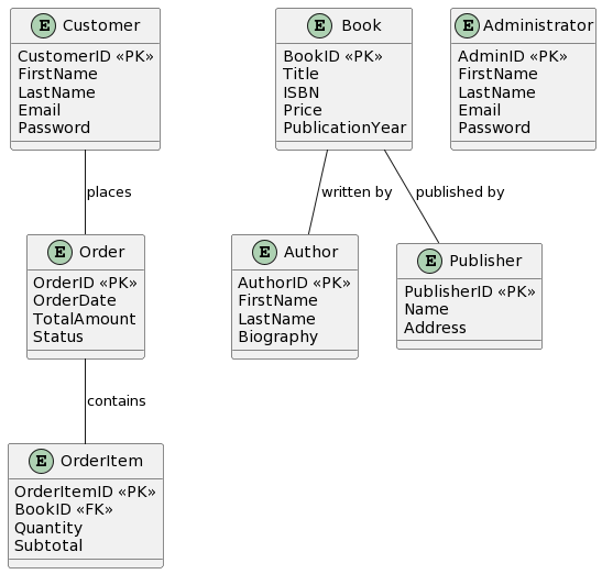- Book: BookID (Primary Key), Title, ISBN, Price, PublicationYear.