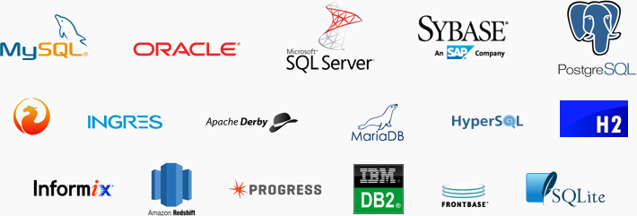 Supports database generation and reversal for all popular databases in the market, including MySQL, MS SQL Server, Oracle, Sybase, PostgreSQL, HSQL, MariaDB, Derby, Informix, Firebird, SQLite, IBM DB2, FrontBase, H2, Amazon Redshift and etc.