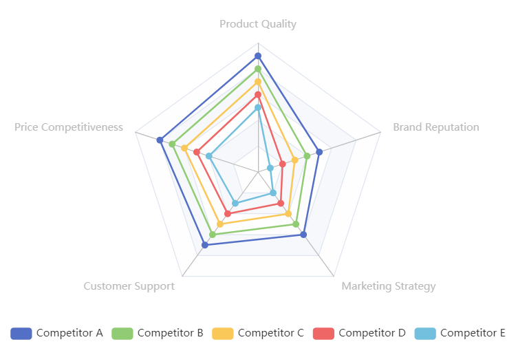 The spider chart populates it with sample data for five competitors. The legend is placed at the bottom of the chart.