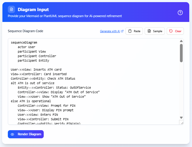 Click Render Diagram to generate a preview of your sequence diagram. This step renders the diagram directly from your input code without AI involvement.