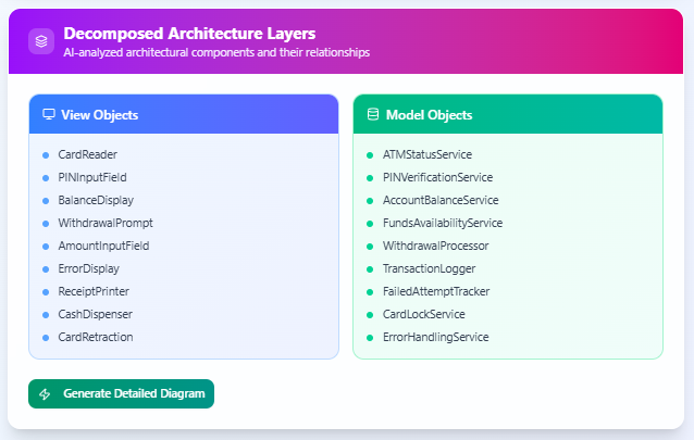 The AI will analyze your sequence diagram and extract a list of architectural components, categorized as: