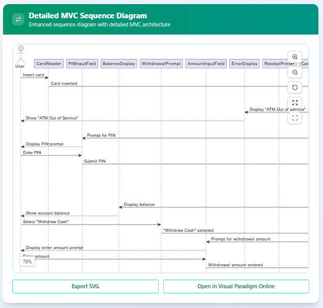 MVC Focus: The tool emphasizes transforming sequence diagrams into MVC architecture, helping developers and architects clearly define the separation of concerns in their systems.
