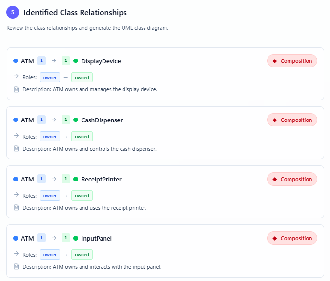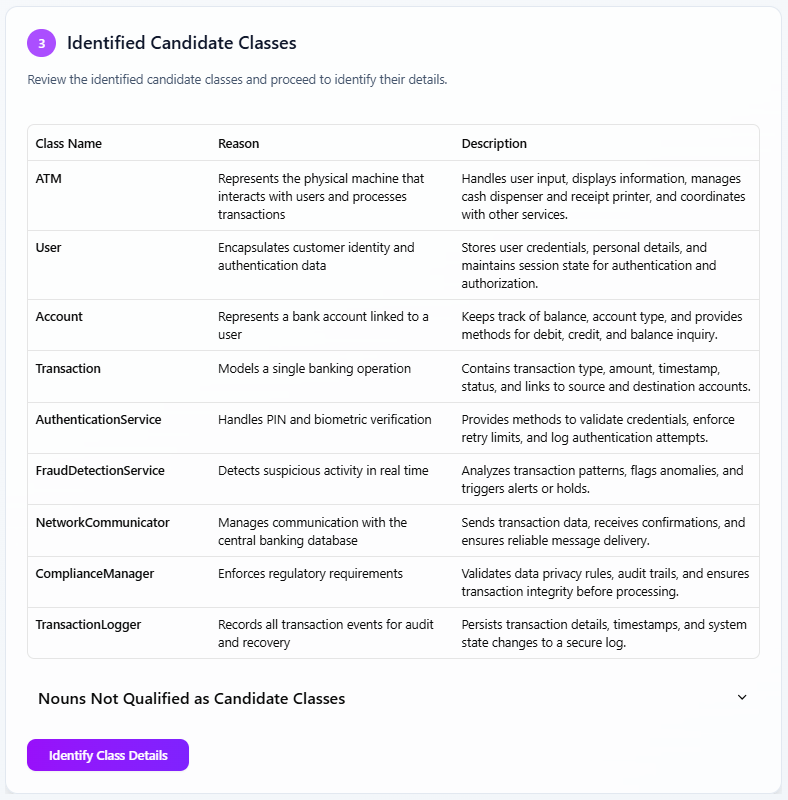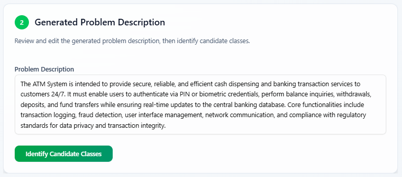 • Iterative Process: You can revisit earlier steps (e.g., editing the problem description or candidate classes) if needed to improve the outcome.