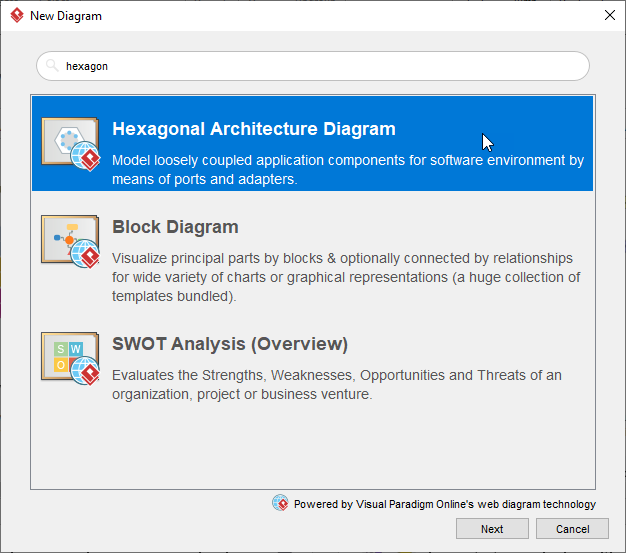 - Select Hexagonal Architecture Diagram and click Next. Note that you have to create a VP Online account to continue. Creating an account is free.