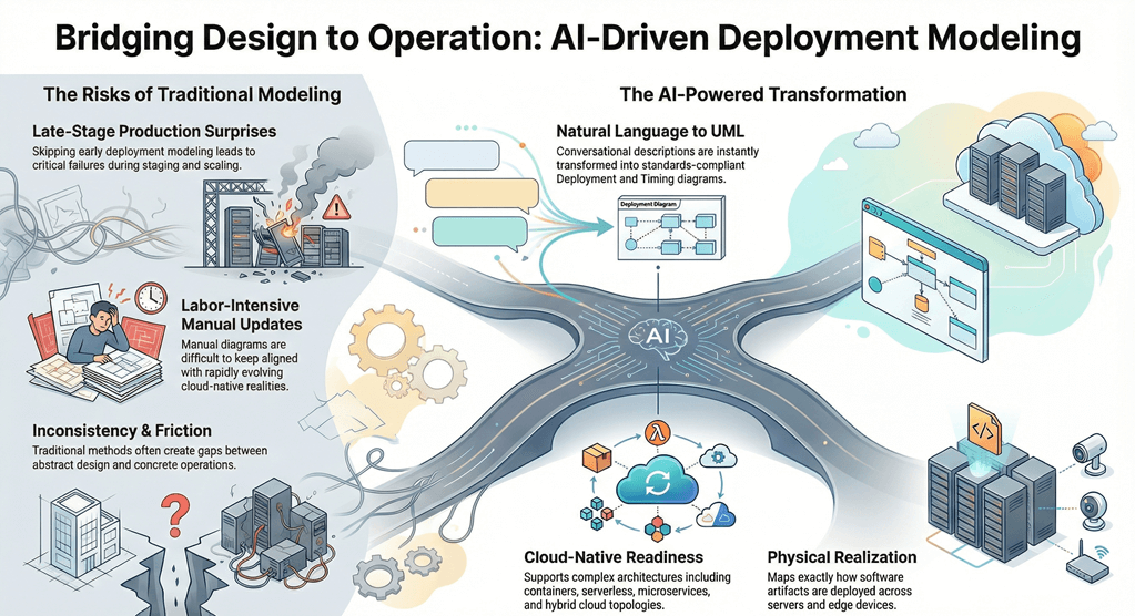 Traditional deployment and infrastructure modeling often occurs late – or not at all – leading to surprises during staging, scaling, or production incidents. Manually creating Component, Deployment, and Timing Diagrams is labor-intensive, prone to inconsistency, and difficult to keep aligned with evolving requirements and cloud-native realities.