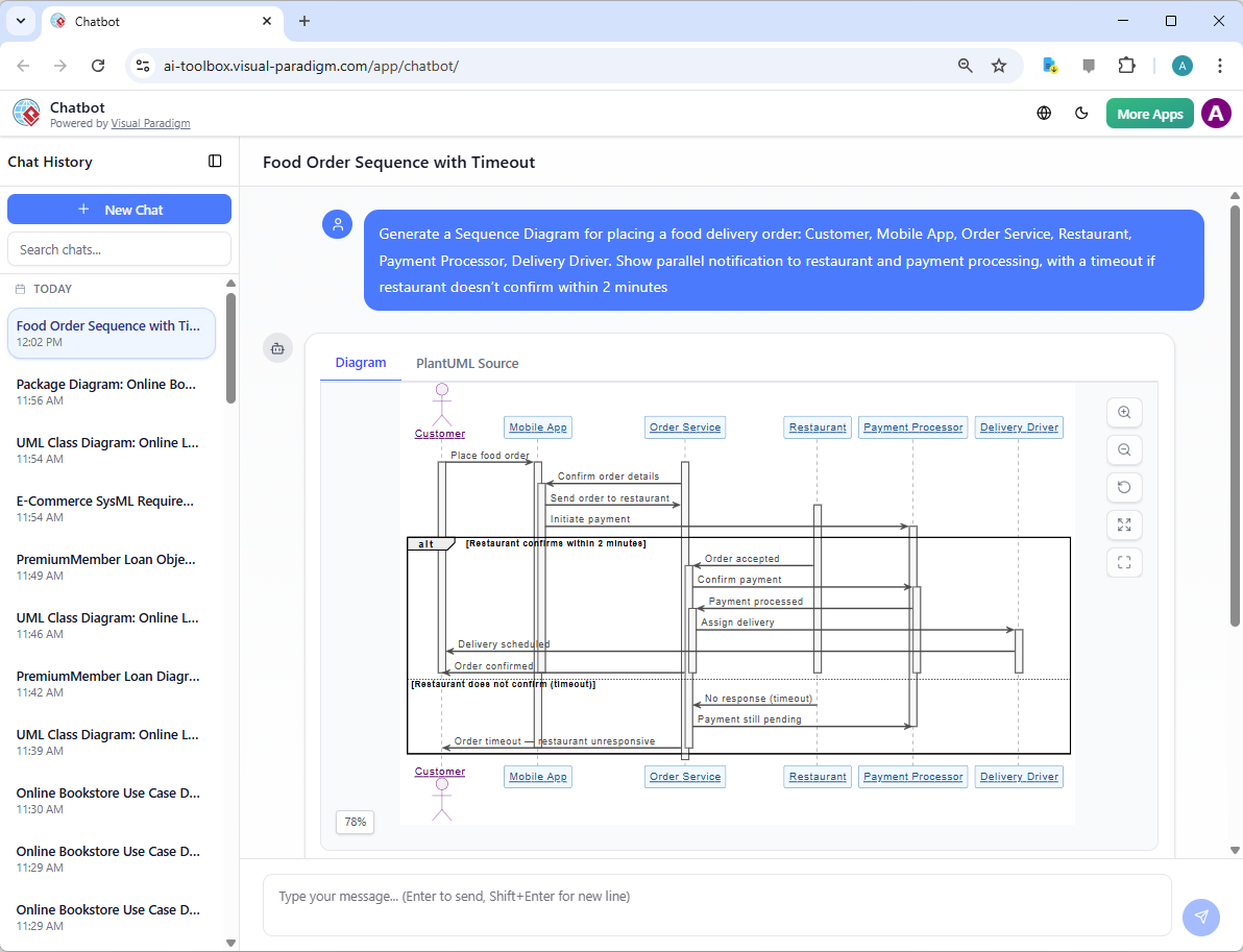 • “Generate a Sequence Diagram for placing a food delivery order: Customer, Mobile App, Order Service, Restaurant, Payment Processor, Delivery Driver. Show parallel notification to restaurant and payment processing, with a timeout if restaurant doesn’t confirm within 2 minutes.”